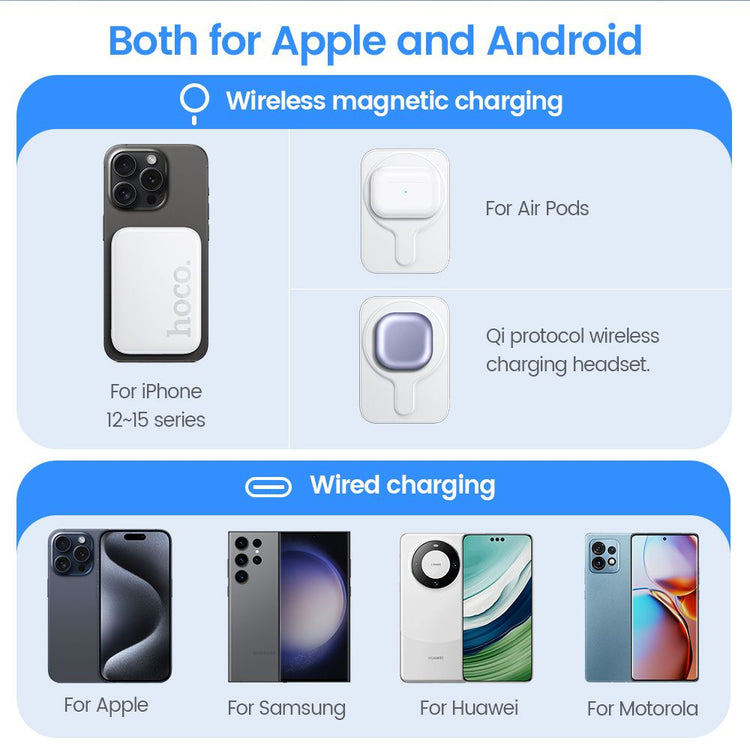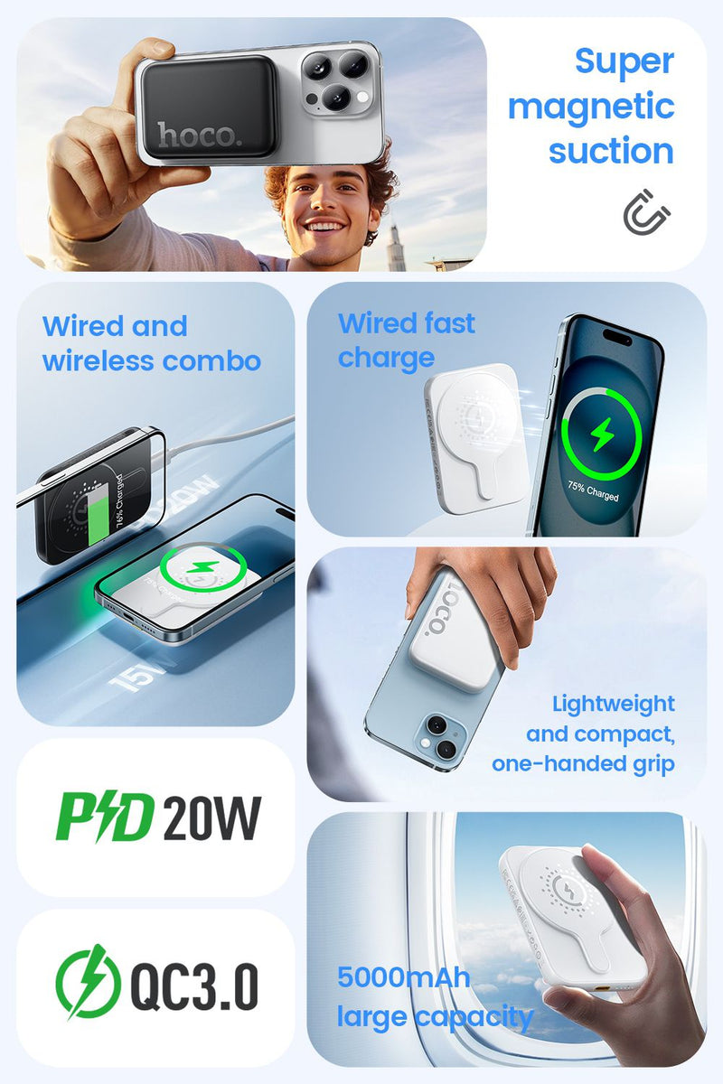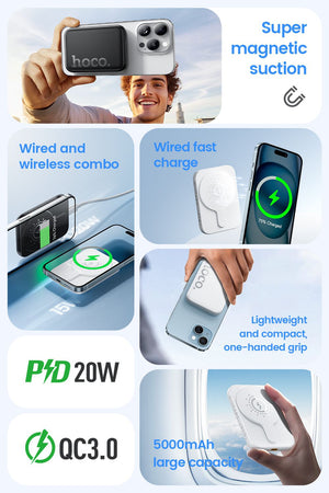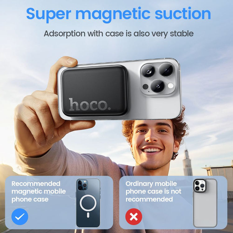 Compact Magsafe Power Bank: Elevate your charging setup with Hoco's sleek and compact Magsafe magnetic power bank, meticulously crafted to seamlessly complement your iPhone 15/14/13/12.