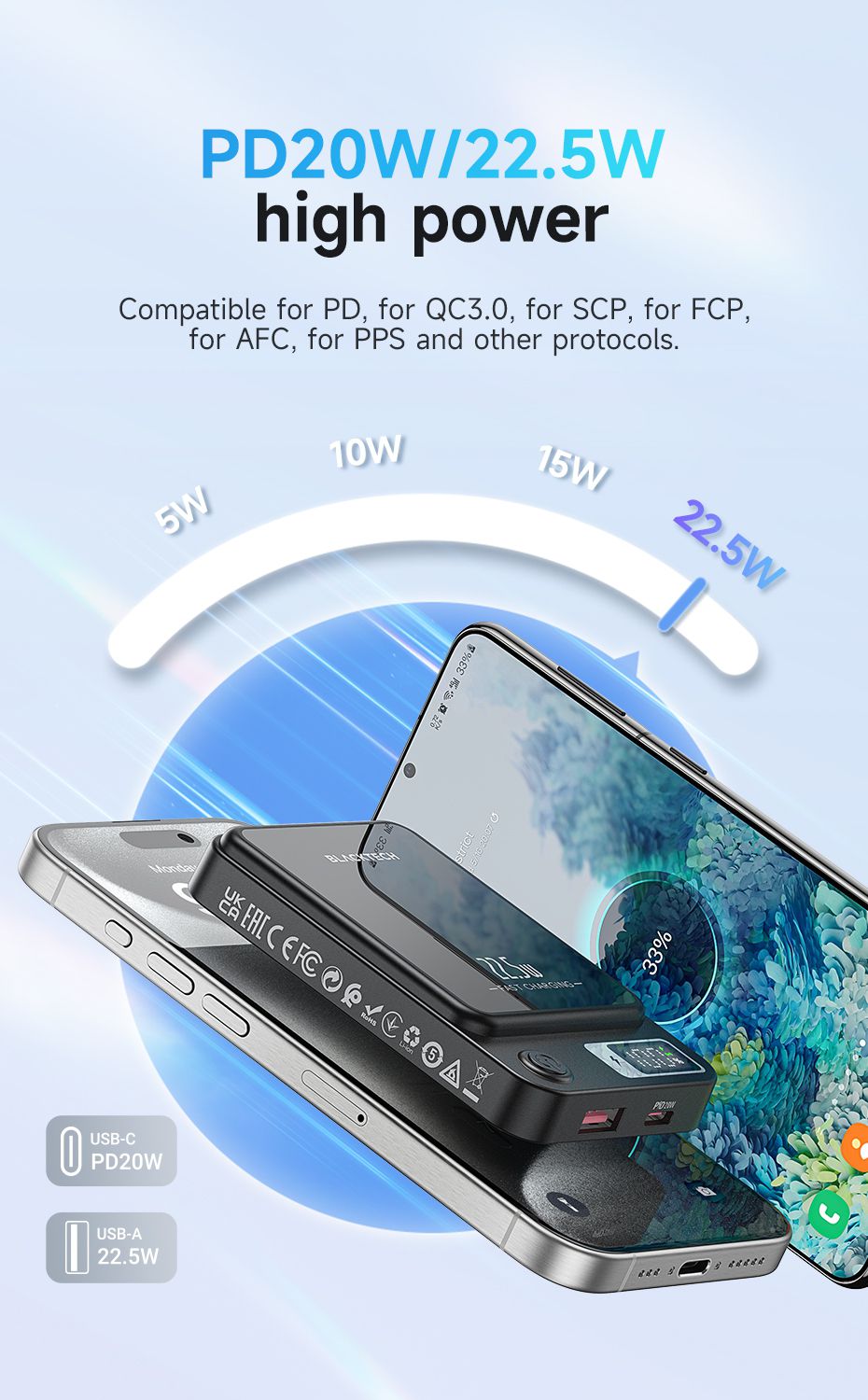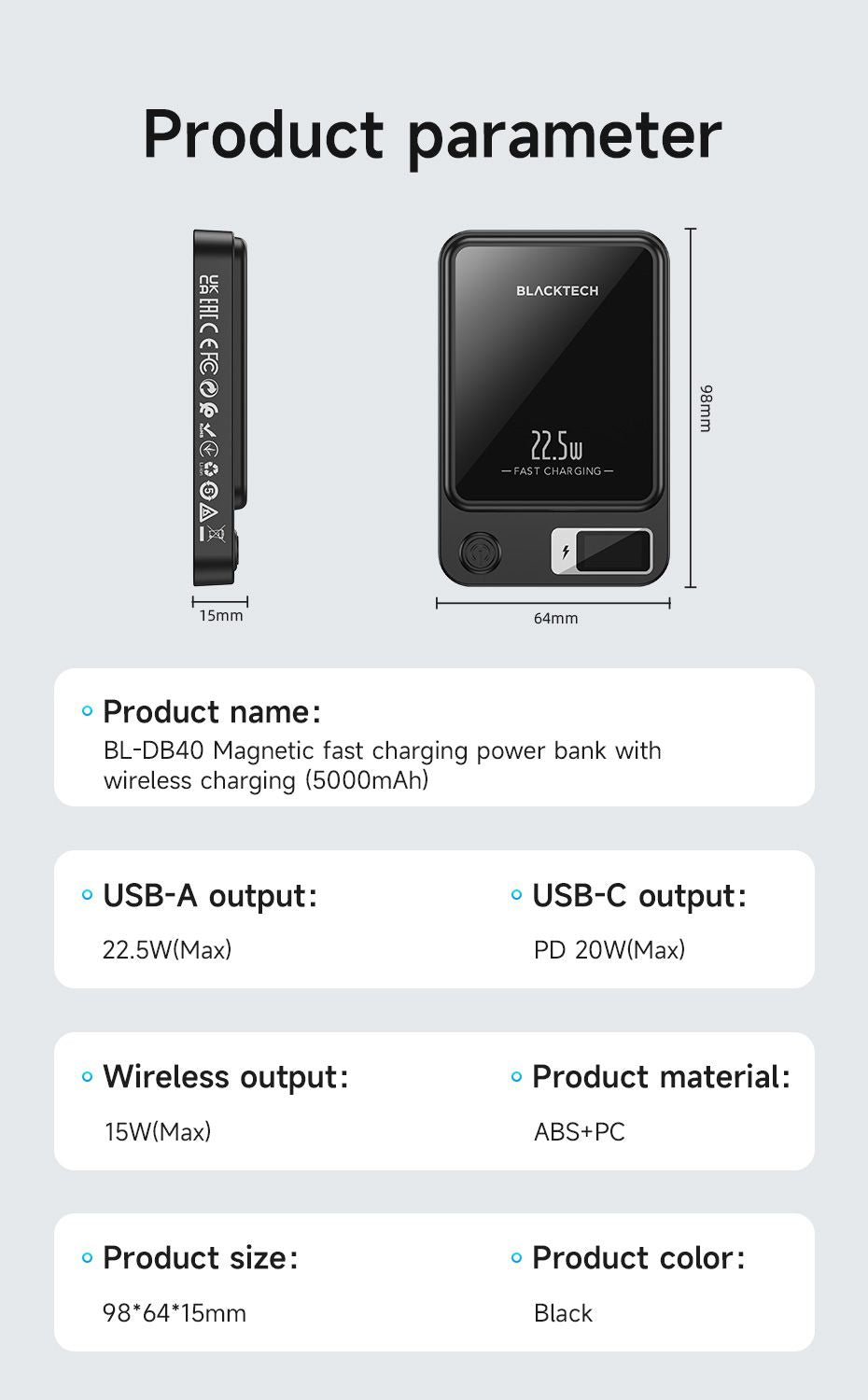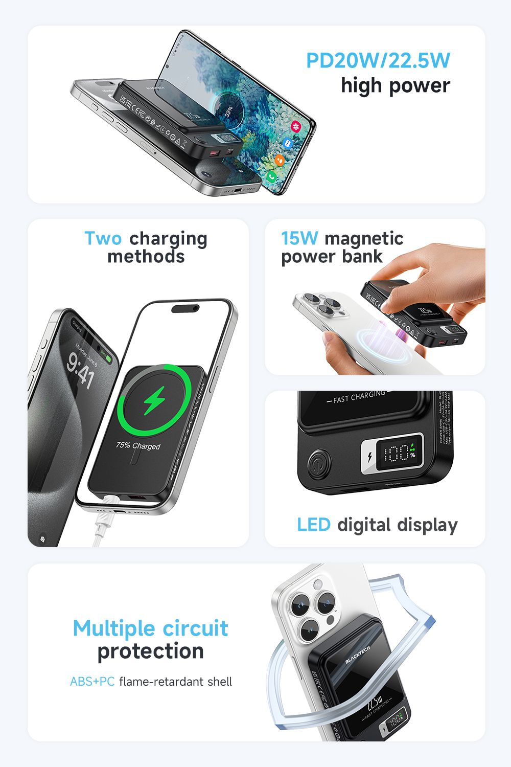 - Magsafe Magnetic Charging: Elevate your charging experience with the Blacktech 20W Magsafe Magnetic Mini Power Bank, designed to seamlessly complement and enhance your iPhone 15/14/13/12's charging capabilities.