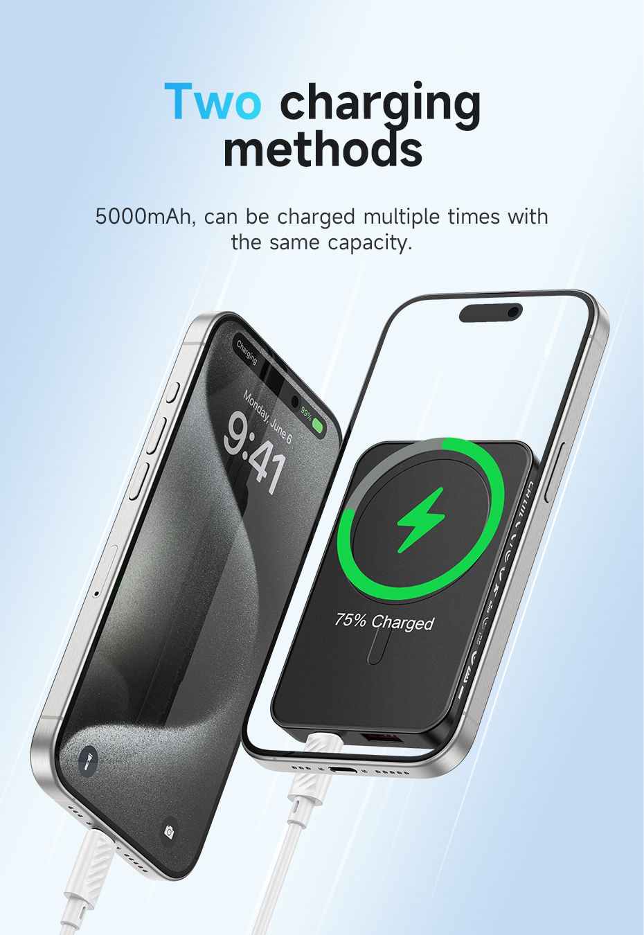 - Super-Strong Magnets: Trust in a secure attachment with super-strong magnets, guaranteeing a stable connection between the power bank and your iPhone for confident and reliable charging.