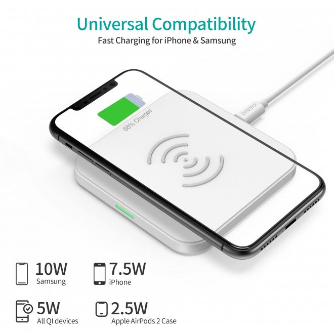 10W Slim Qi Certified Wireless Charging Pad: Fast wireless charging up to 10W for compatible devices and standard 5W wireless charging for all Qi-enabled phones.
