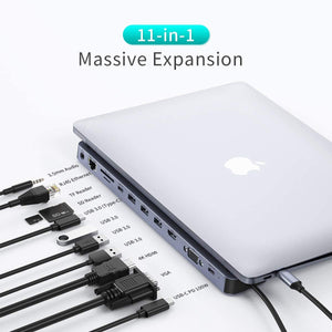 11-in-1 Connectivity Hub: This multiport docking station offers an extensive array of ports, including 4x USB 3.0, 1x USB-C PD port, HDMI, VGA, RJ45 Gigabit Ethernet, and an Audio/Mic 2-in-1 port. It also includes slots for SD and Micro-SD cards, providing comprehensive connectivity options.
