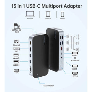 - 15 in 1 USB-C Multiport Docking Station:Β Equipped with one PD3.0, one USB-C (host), one 3.5mm Audio & mic, one USB-C data, one USB-A 3.1, two USB-A 3.0, two USB-A 2.0 one VGA, two HDMI, one DP, one RJ45 and one SD&TF card, this USB-C Hub turns PC laptop into a mobile workstation.