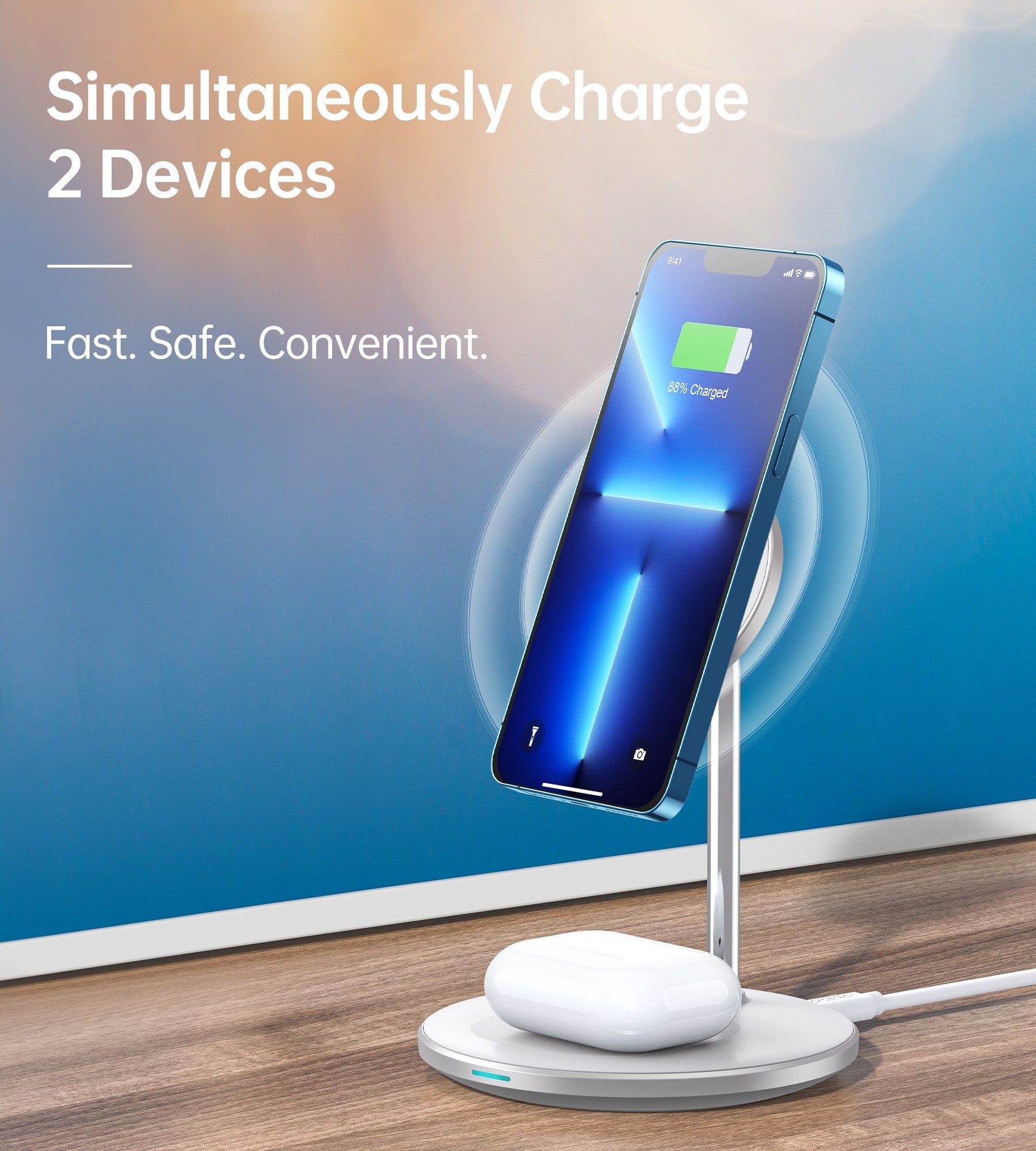 Unique LED lights indicate the charging status of your smartphone and earbuds at the same time. Qi & ETL Certified integrated smart chip keeps our magsafe wireless phone chargerΒ stand from over-charging, over-heating and short-circuit, providing a safe and secure charging environment.