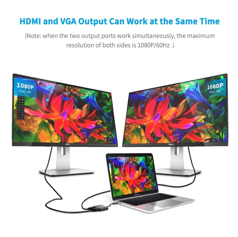 Dual Display Powerhouse: Harness the power of dual displays with the ability to output both HDMI and VGA simultaneously. This adapter supports a maximum resolution of 1080p/60Hz for both displays, ensuring crystal-clear visuals.