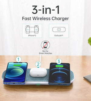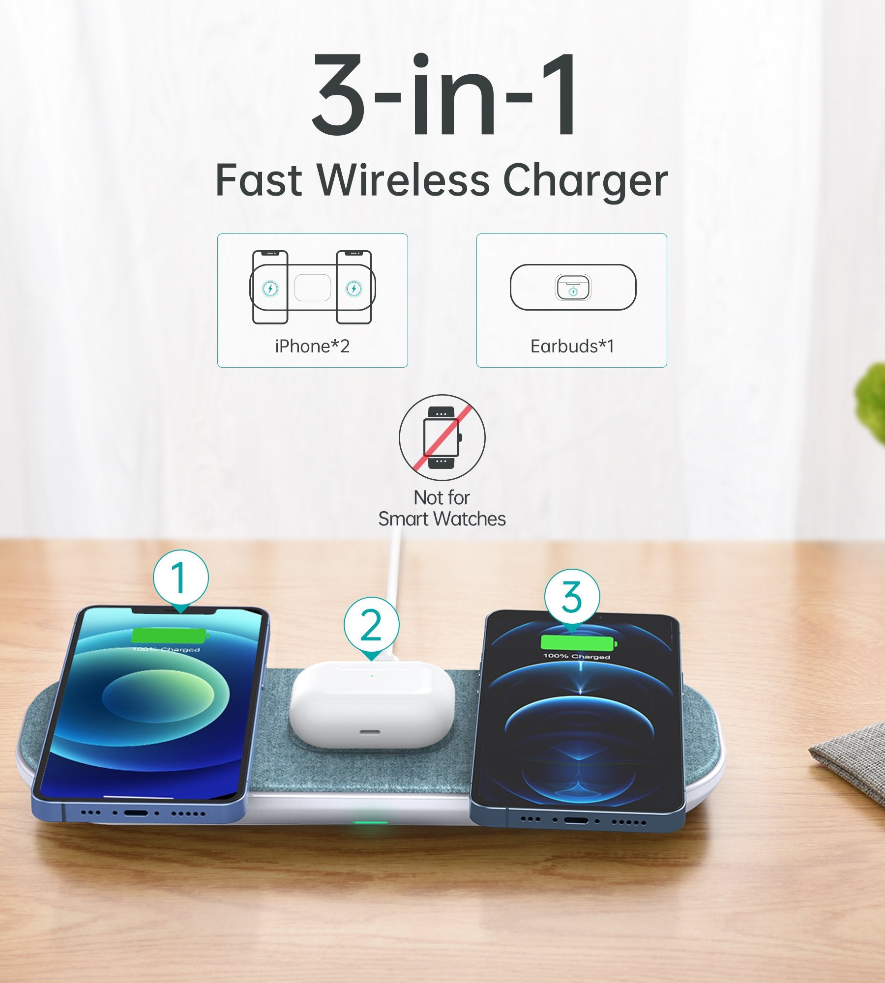 Powerful Wireless Charge for Three Devices: Supports charging three Qi-enabled devices simultaneously with regular charging speed. The middle coil is designed for charging new AirPods. Note: Does not support Qi-enabled watches like Apple Watch or Samsung Watch.