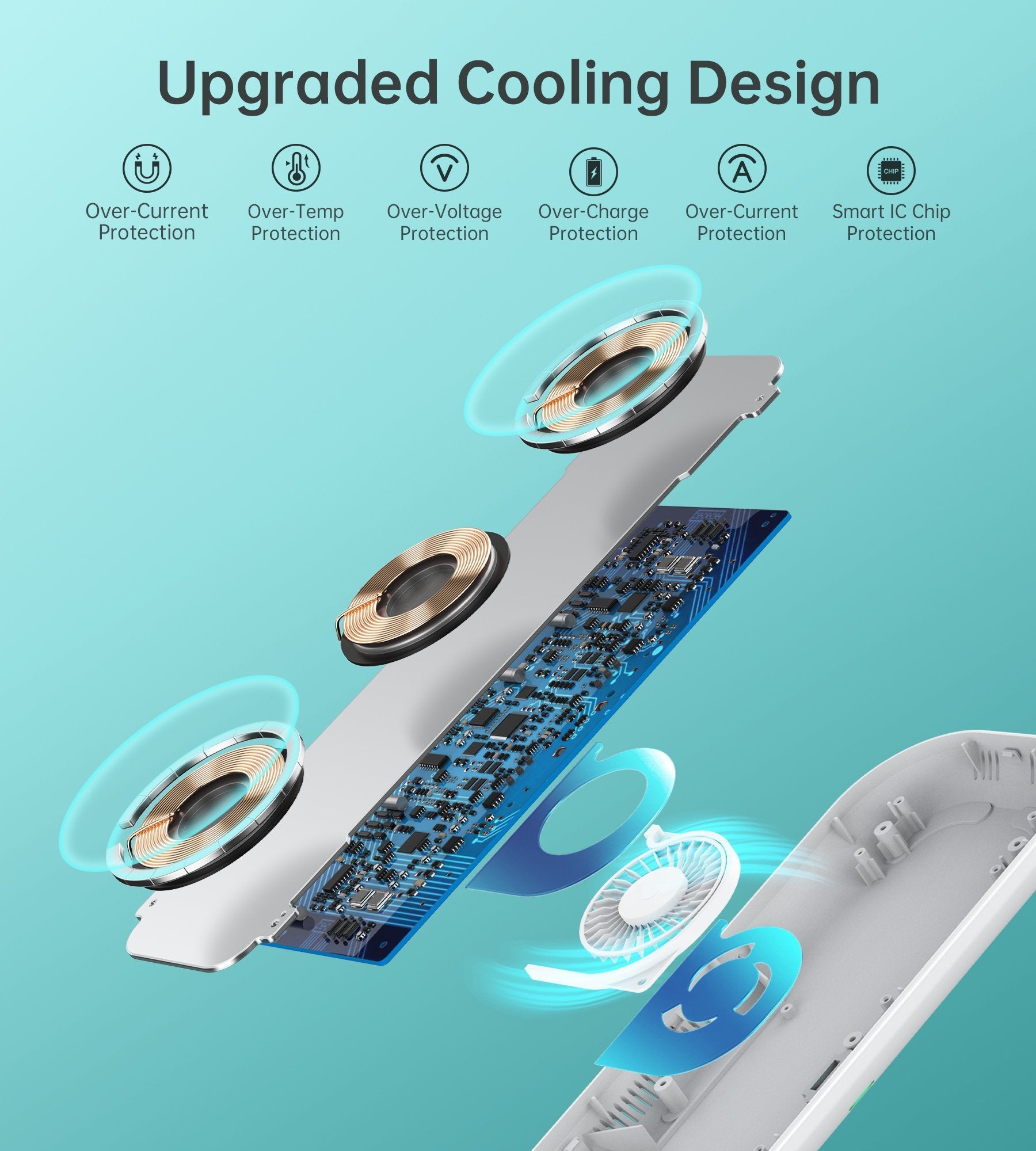 Certified Safe Charging: Meets Qi wireless charging standards with built-in protections for overheating, overcharging, and short circuit. Includes a super silent cooling fan and comes with a 12V/4A DC adapter and a 1.5-meter cable for faster wireless charging. Note: Do not use the included adapter to charge other devices.
