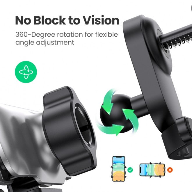 Auto-Clamp Linkage Technology: With auto-clamp linkage technology, mounting your phone becomes effortless. Simply drop your phone into the holder, and the gravity-based mechanism will automatically secure and clamp it in place. This intuitive design allows for quick and easy one-handed operation.