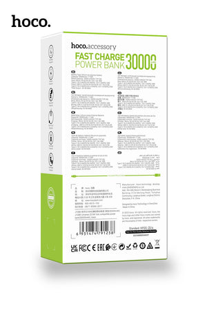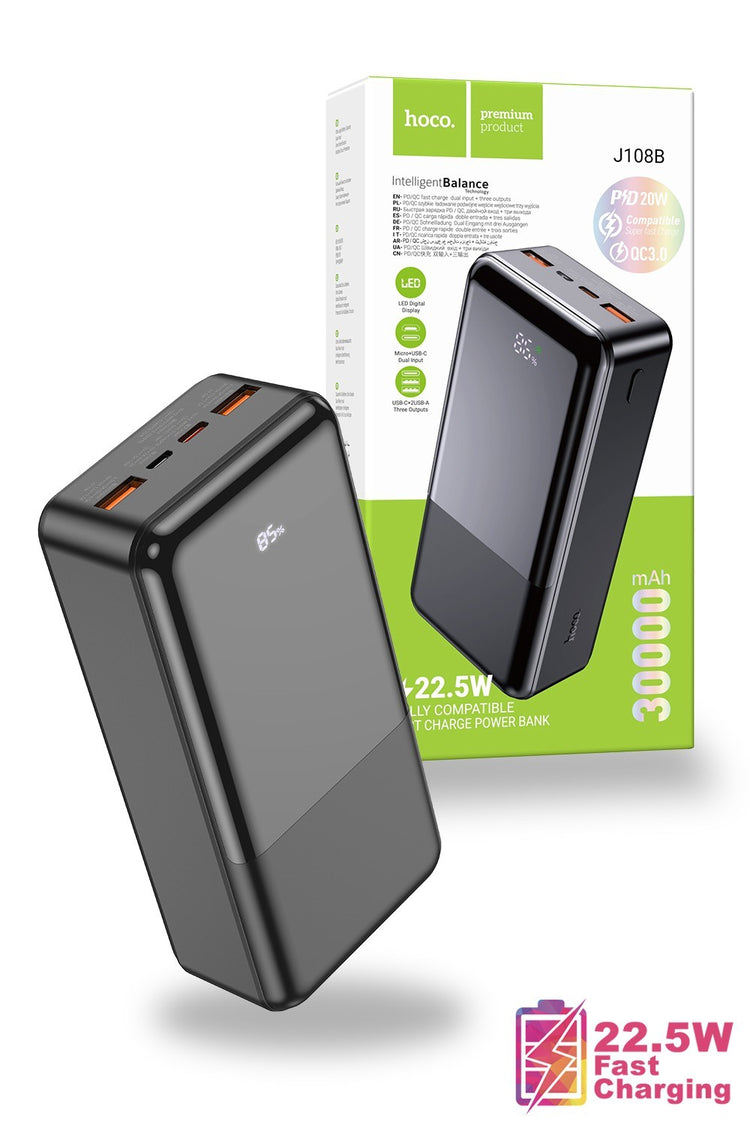 Ultra-Fast Charging: The Hoco 22.5W 30000mAh Power Bank (J108B) ensures ultra-fast charging at 22.5W for devices compatible with QC3.0 and PD3.0. Enjoy swift charging for your gadgets.