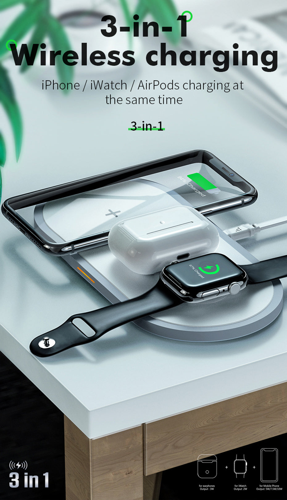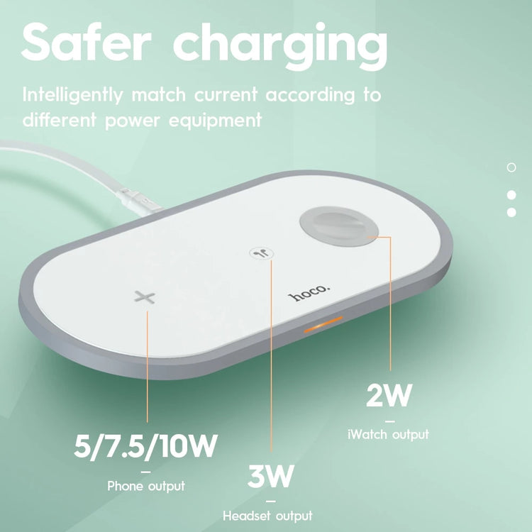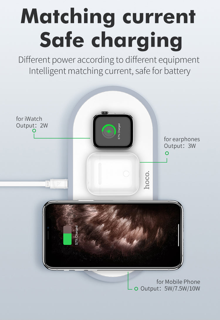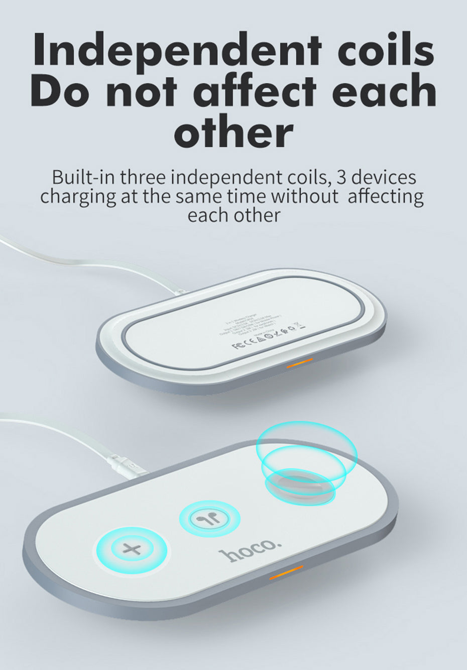 3-in-1 Multiple Charging: The Hoco CW45 Qi Ultra Fast Wireless Charger is designed for versatile charging, enabling you to charge a phone, iWatch, and Airpods simultaneously. Streamline your charging routine with one convenient solution.
