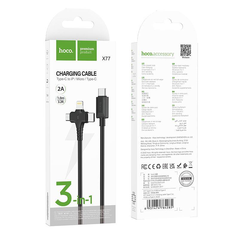 Hoco 3 in 1 USB-C to USB-C Lightning Micro-USB Charging Cable X77