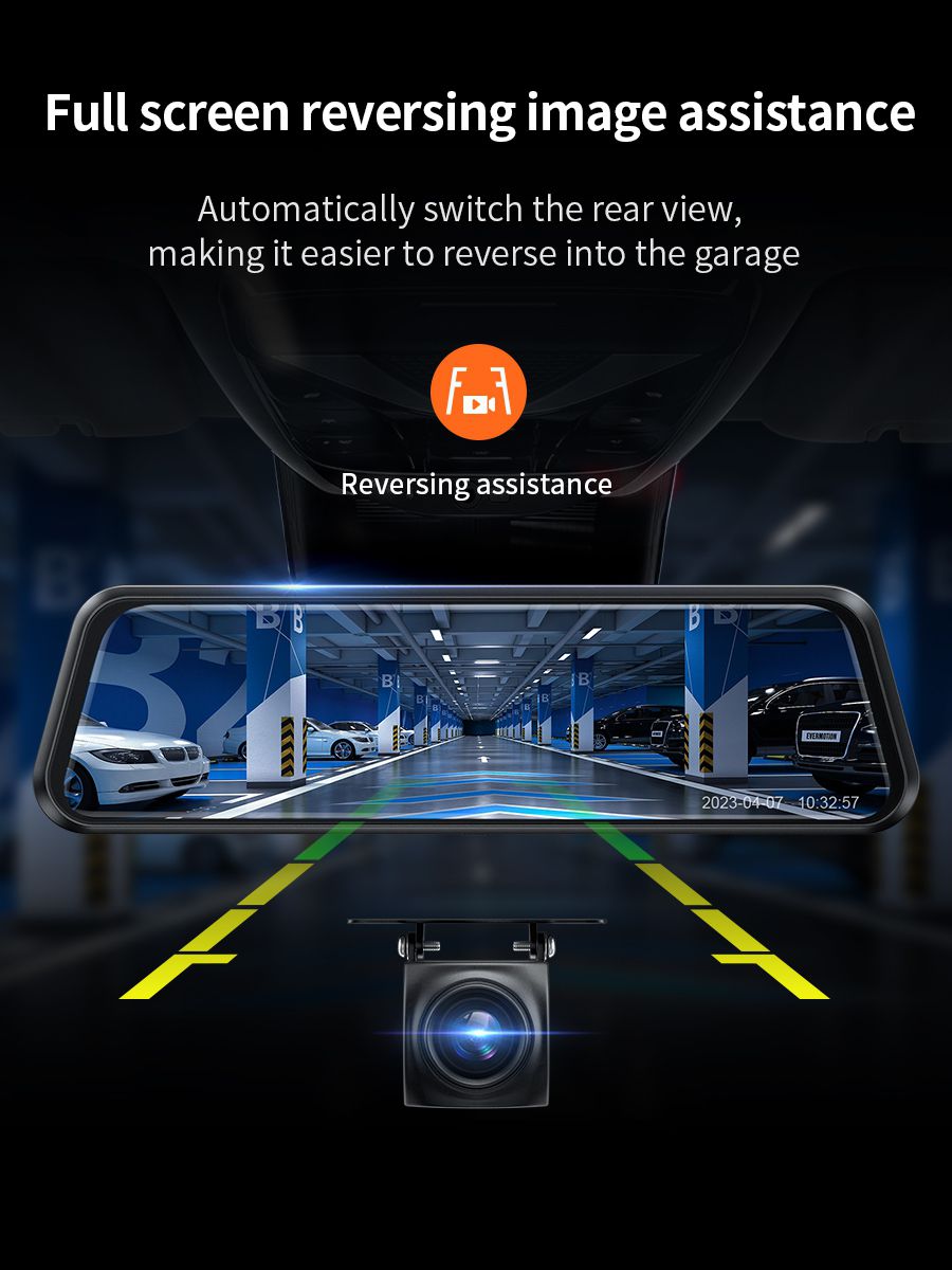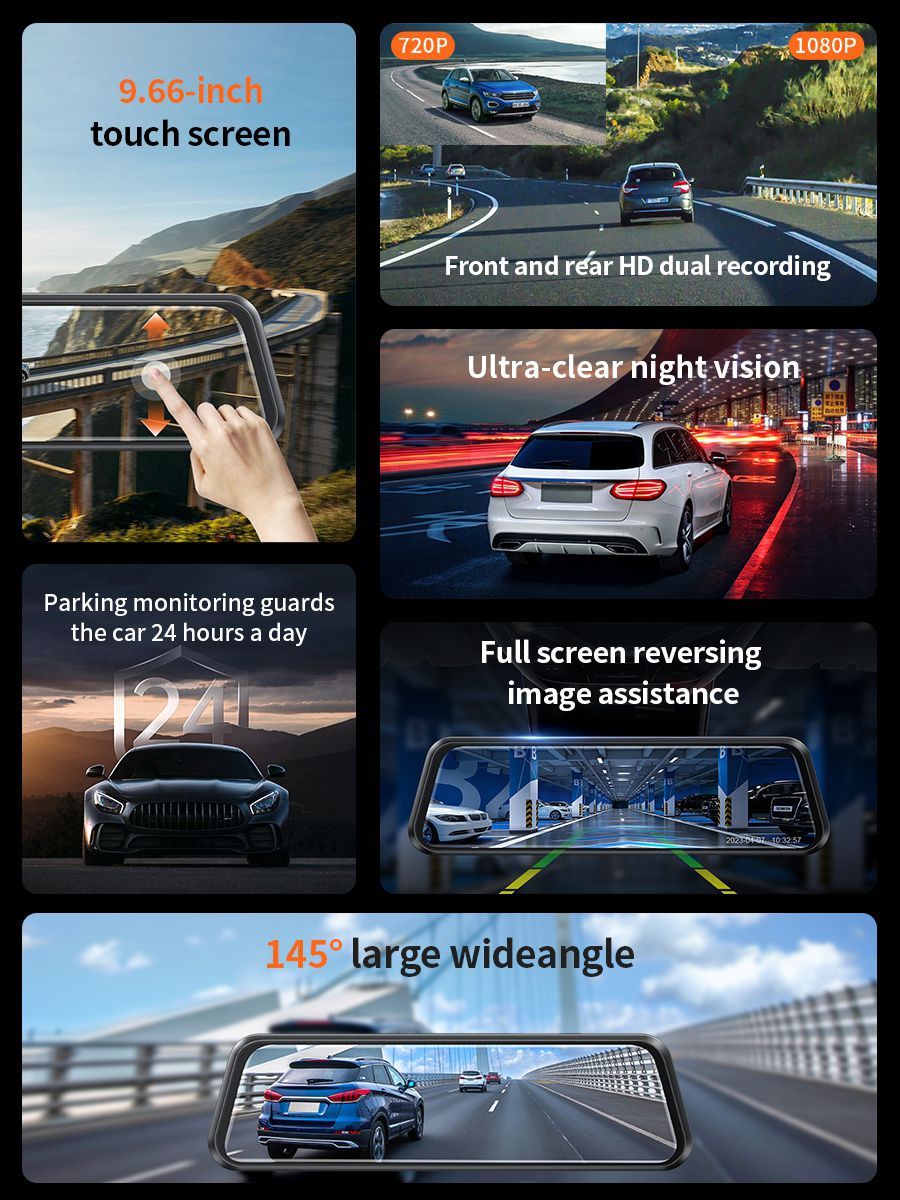 User-Friendly 9.66-Inch Touch Screen: The user-friendly 9.66-inch touch screen simplifies operation and navigation. Easily access settings, view recordings, and manage your dashcam with the intuitive touch interface.