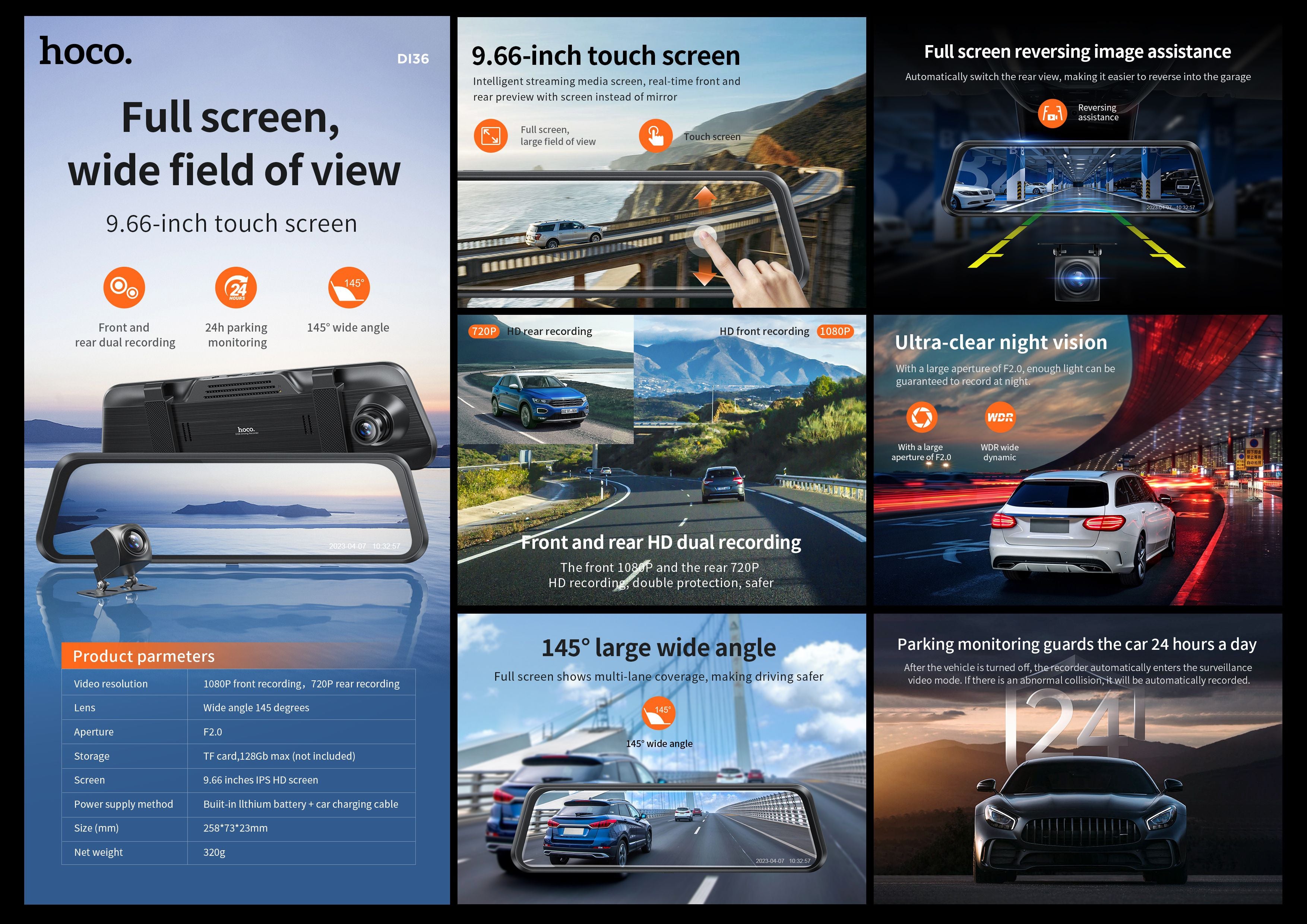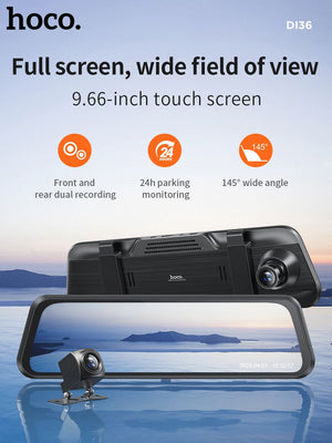 High-Resolution Dual Recording: The Hoco Car Camera Driving Recorder Dashcam DI36 features a 9.66-inch touch screen, providing a clear and immersive view. Enjoy high-resolution dual recording capability, capturing both front and rear perspectives for comprehensive coverage.