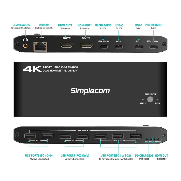 Simplecom Dual 4K HDMI KVM Switch and Docking Station USB-C KM590