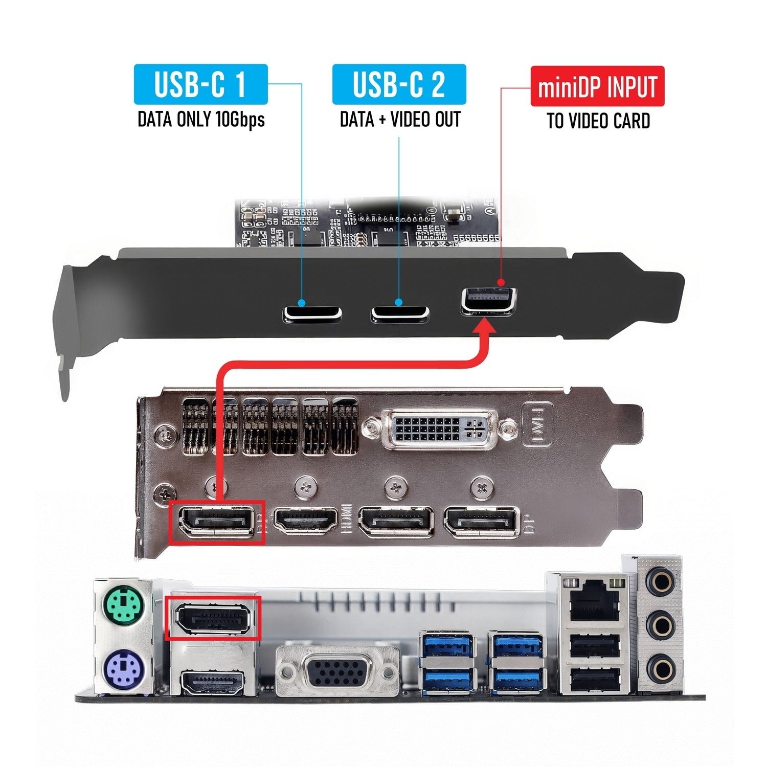 Mini DisplayPort Input: Connect your GPU's output to the card's Mini DP input to enable full video-over-USB-C functionality for modern monitors.