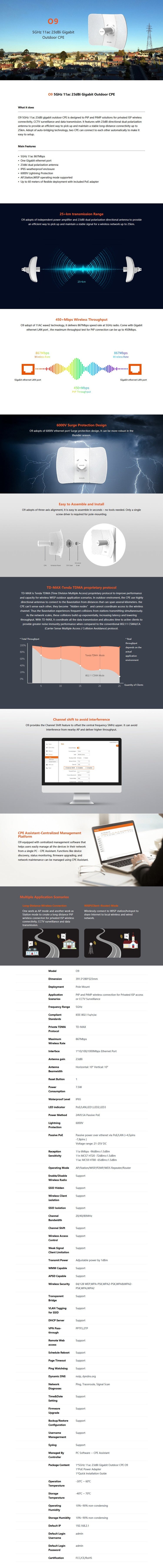 Long-Range 5GHz Outdoor Bridge: The Tenda O9 is a 5GHz 11ac outdoor CPE designed for point-to-point and point-to-multipoint wireless bridging over long distances.