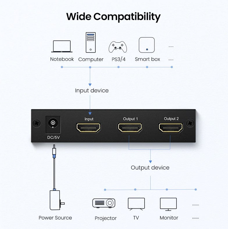 Easy Setup: With a user-friendly design, the Ugreen HDMI Splitter is easy to set up. Simply connect your HDMI source to the input port and two displays to the output ports, and you're ready to go.
