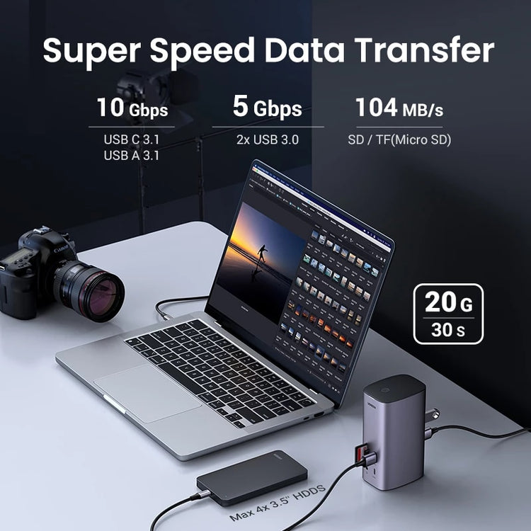 - Transfer files at incredible speeds through the many USB input ports from 10Gbps from USB-C, 5Gbps from USB-A and 104 Mb/S from SD/TF