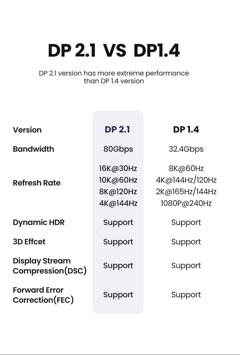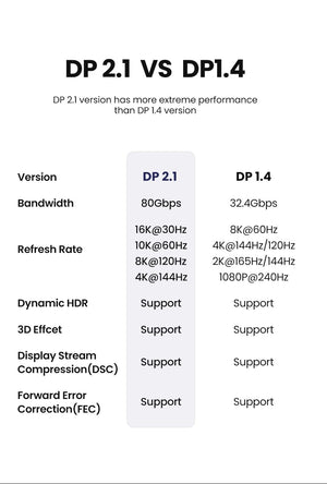 VESA Certified: This DisplayPort 2.1 cable is VESA certified, ensuring reliable and high-speed data transmission with a bandwidth of up to 80Gbps. It supports a range of resolutions, including 16K@60Hz, 10K@60Hz, 8K@60Hz, 4K@144Hz, and 2K@240Hz. The cable is backward compatible with DisplayPort 1.4/1.2.