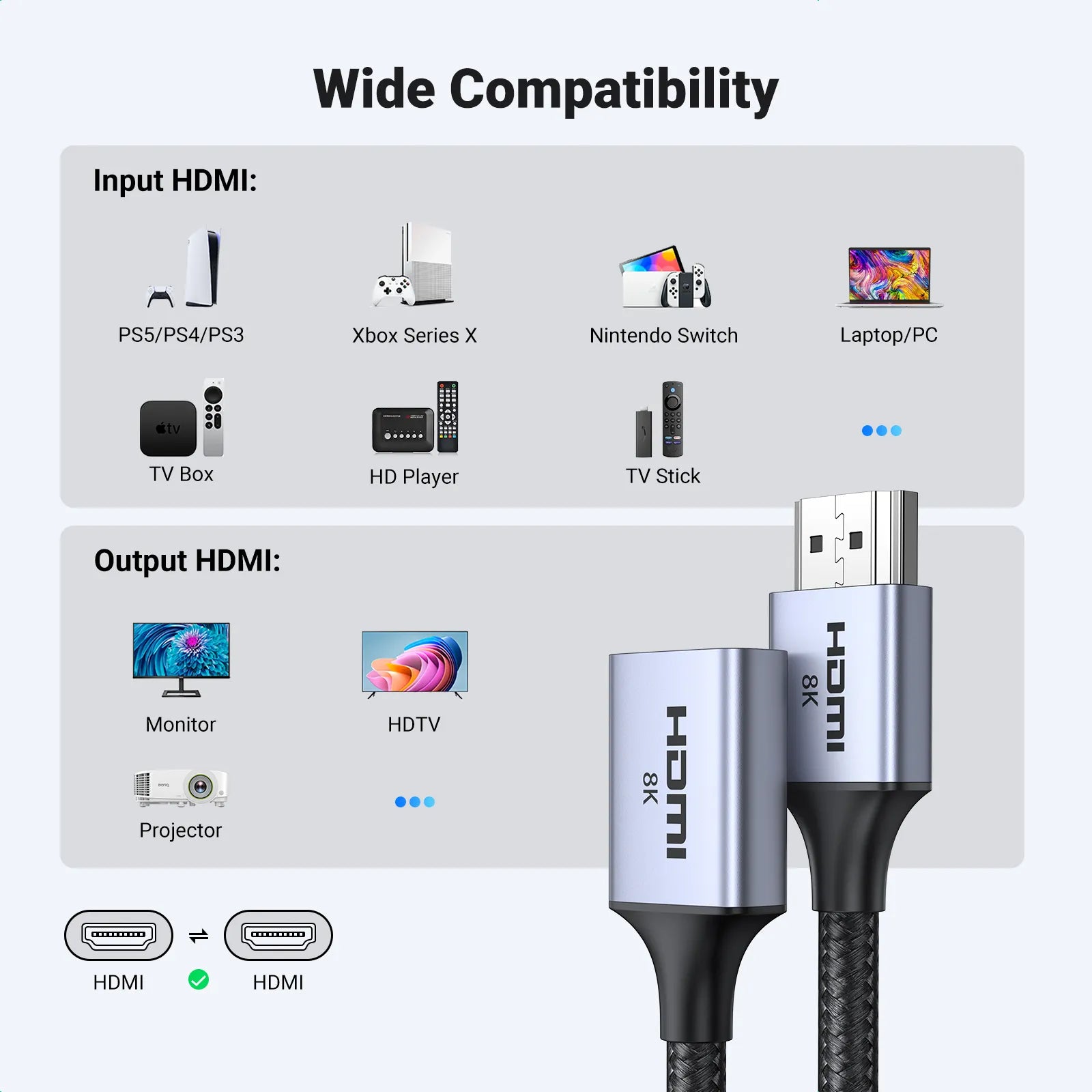 - Ultra High-Speed Cable: The 8K HDMI extender cable has a data transmission speed of up to 48Gbps, almost 2.6Γ the speed of HDMI 2.0. Support resolution up to 7680 x 4320, refresh rate up to 8K@60Hz, 4K@240Hz, Dynamic HDR. Support VRR ALLM with smoother game experience. Provide you with the most streamlined projection and home theater visual experience