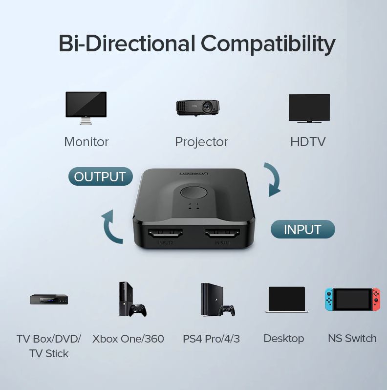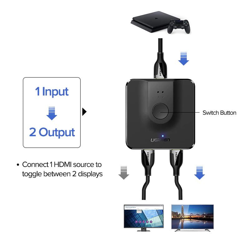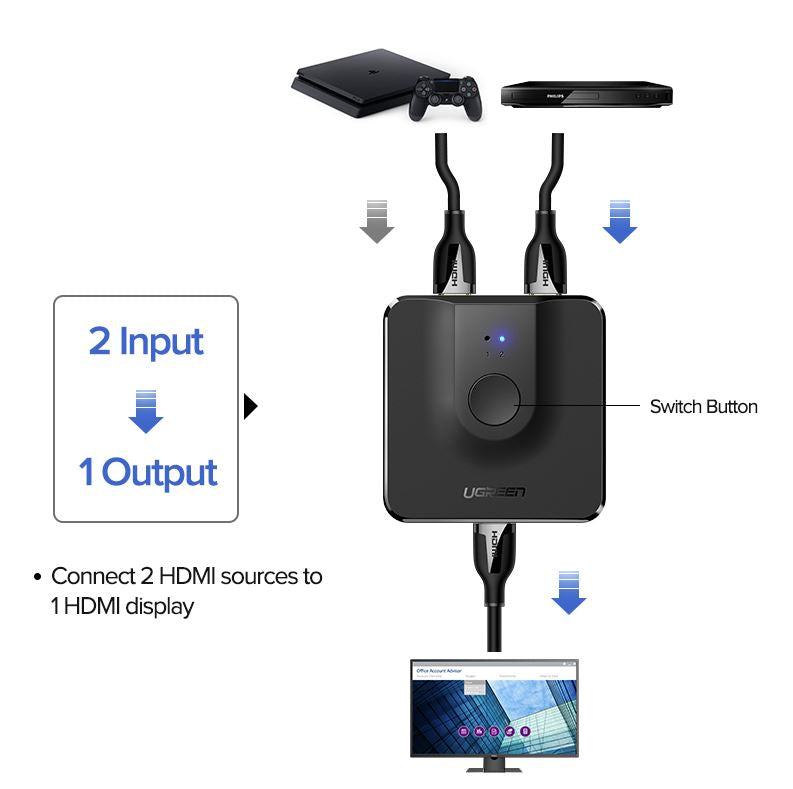 Bi-Directional Functionality: The Ugreen HDMI Switch Splitter is a versatile 2-in-1 solution that enables you to connect two HDMI sources to one display or toggle between two displays with ease.