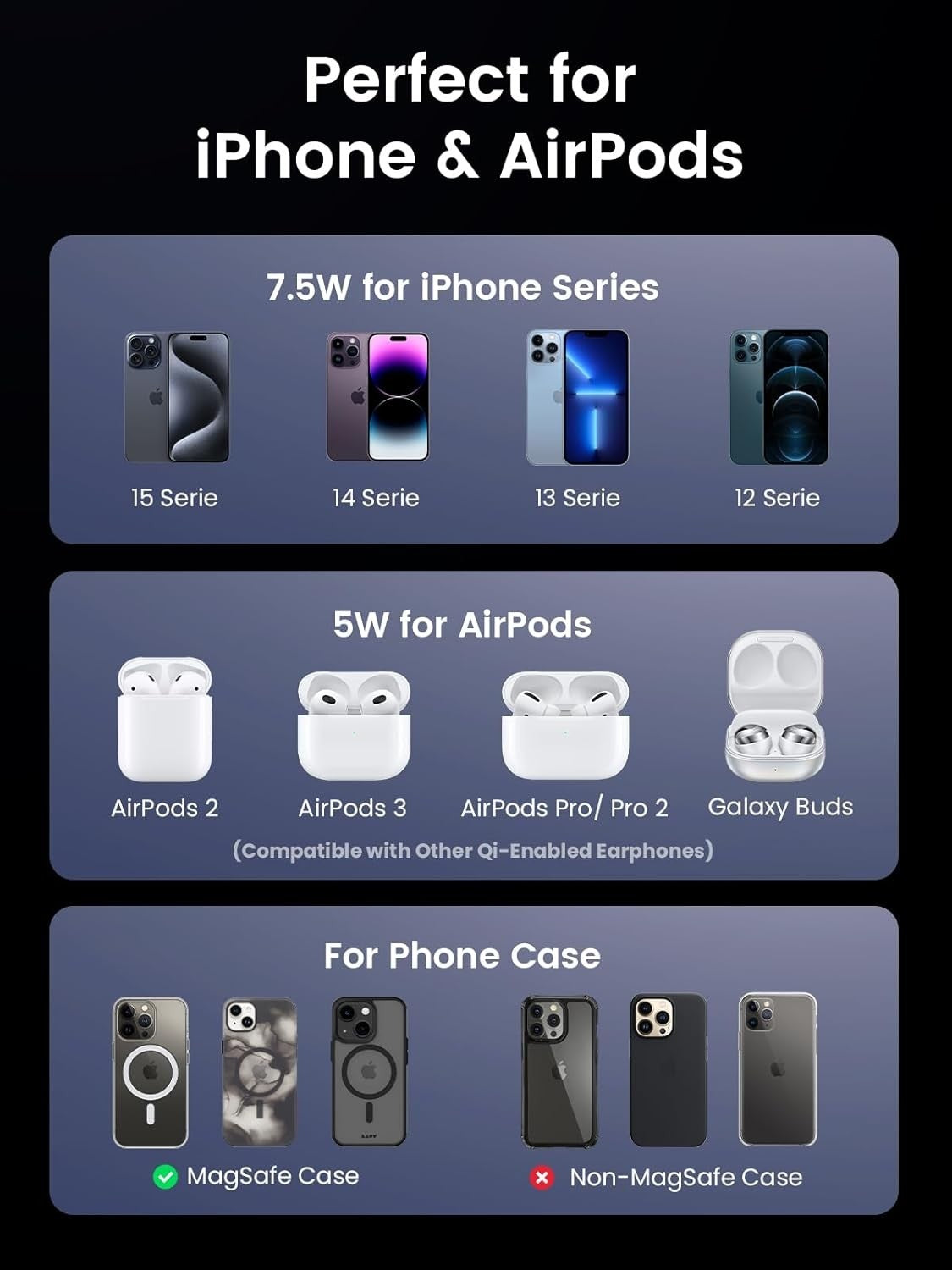- Wide Compatibility: Compatible with iPhone 15/15 Pro/15 Pro Max/14/13/12 series (7.5W for iPhone), AirPods Pro 2/1, AirPods 3/2, Galaxy Buds, and most Qi-supporting devices. Recommended to use with a MagSafe phone case or a bare phone; AirPods 1 not supported. Ensure AirPods have a wireless charging case instead of the lightning case.