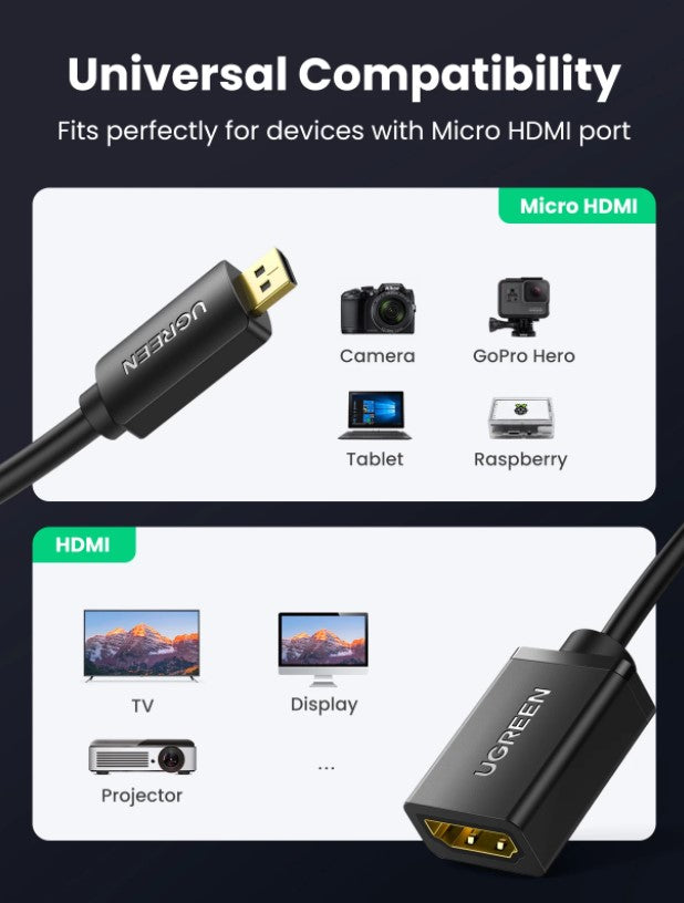 UGREEN Micro HDMI to HDMI Adapter Male to Female with Ethernet Type D to Type A HDMI 2.0 Cable Support 1080P 3D 4K@60Hz