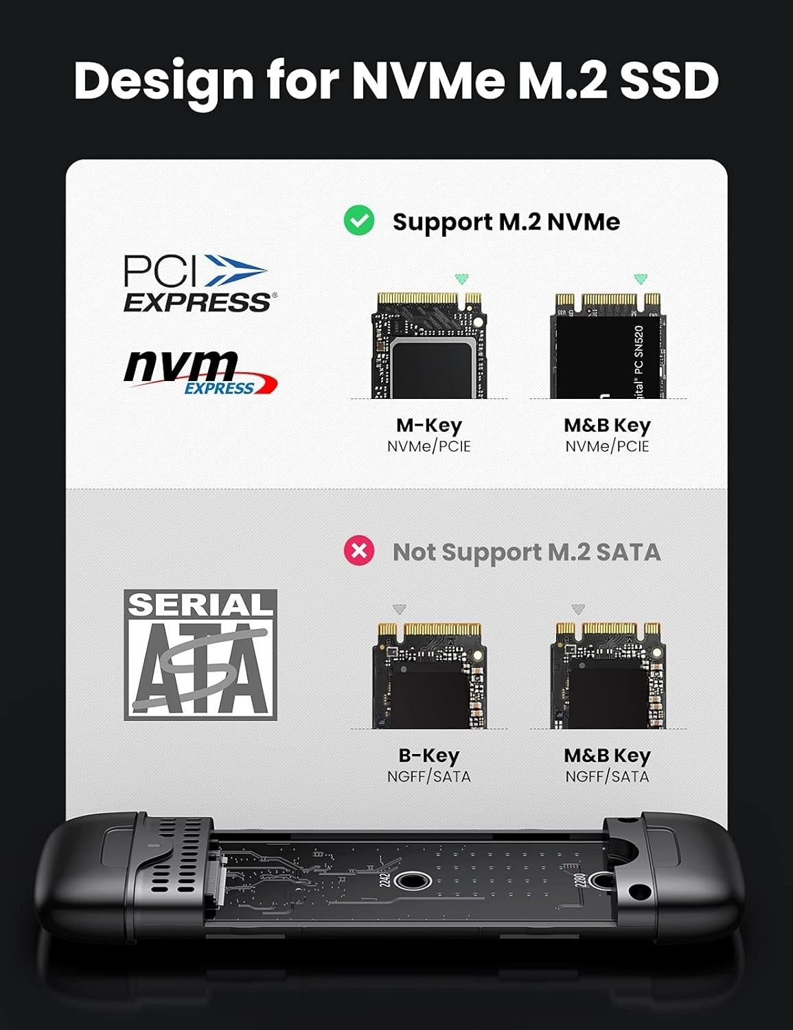- 2 in 1 NVMe Enclosure: Connect M.2 SSD to both USB-C and USB-A devices effortlessly with UGREEN's versatile enclosure. Compatible with M-Key & M+B Key NVMe PCIE SSDs above 2TB, excluding B Key NVMe and M&B Keys SATA.