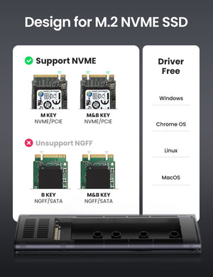 Wide SSD Compatibility: The enclosure is compatible with 2230, 2242, 2260, and 2280 sized SSDs, supporting both M and M+B Key SSDs. This versatility allows you to use a variety of M.2 NVMe SSD models with ease.