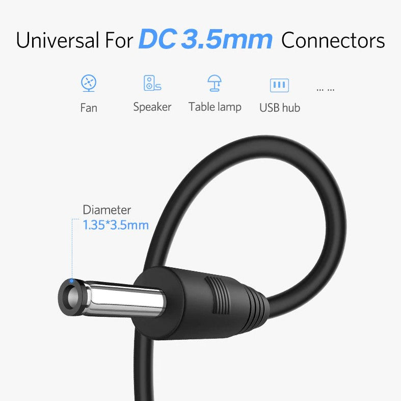 Wide Compatibility: With broad compatibility, this cable is ideal for speakers, hubs, lamps, fans, and other devices with a 3.5mm DC power input. Simplify your setup and power multiple gadgets with a single cable.