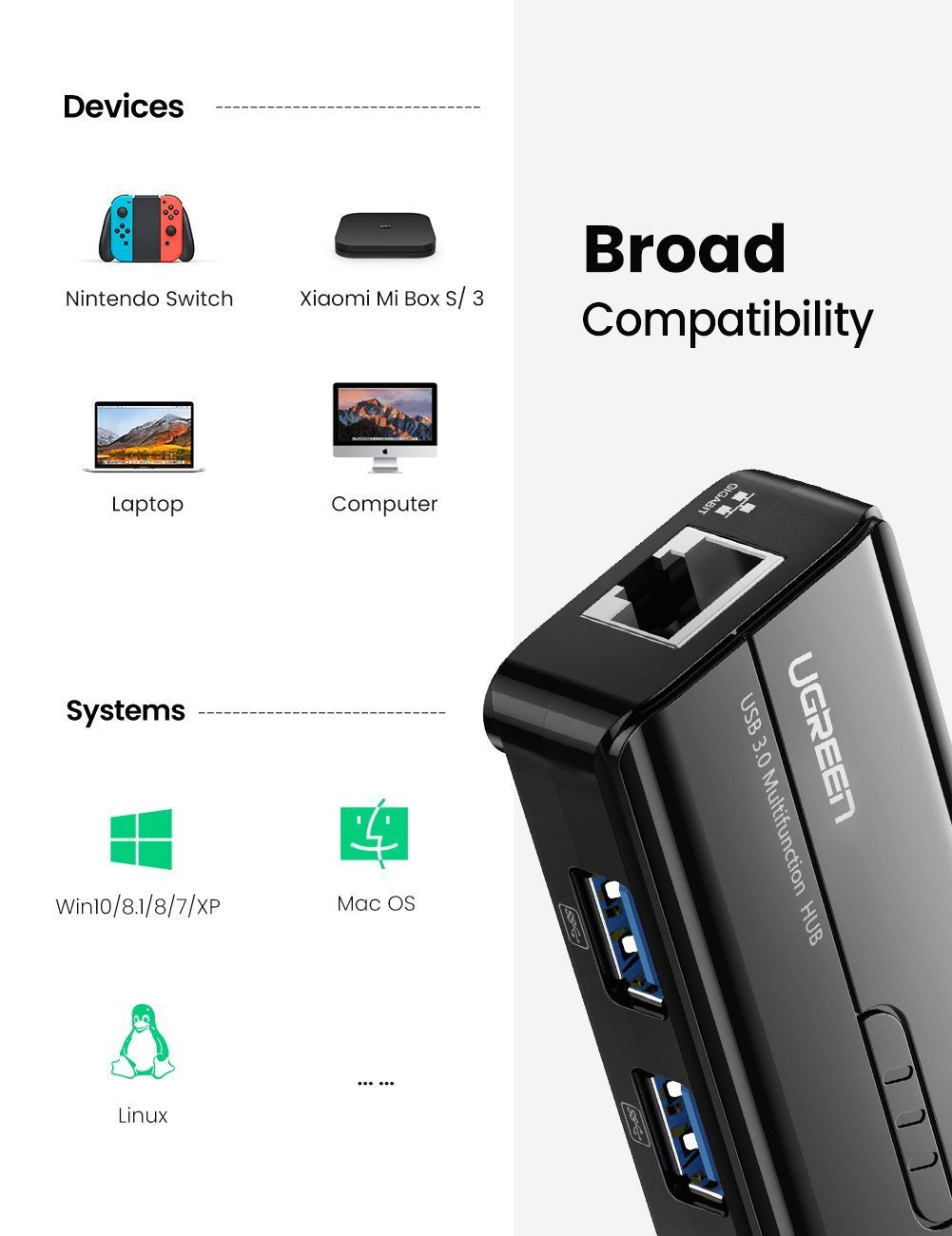 Broad Compatibility: This adapter and hub combo is compatible with a wide range of devices, including PCs, laptops, Nintendo Switch consoles, Xiaomi Mi Box, and more. It's a versatile solution for enhancing the connectivity of various devices.