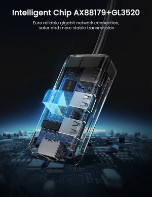 AX88179 + GL3520 Chipsets: Engineered with the AX88179 and GL3520 chipsets, this adapter and hub combo ensures superior stability and high-speed performance. These chipsets are renowned for their reliability and efficiency.