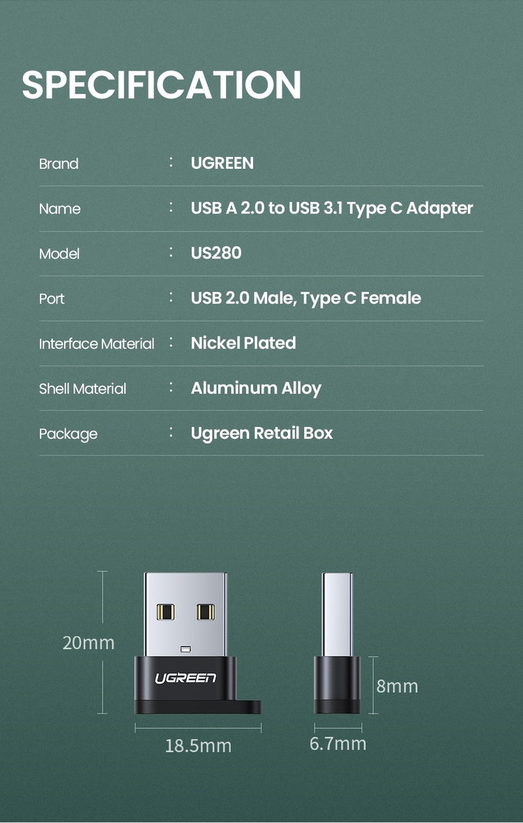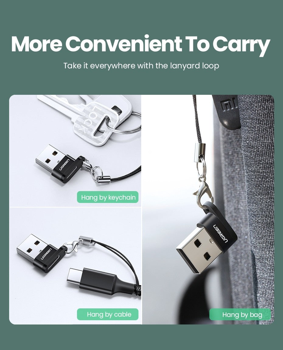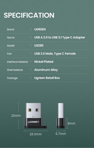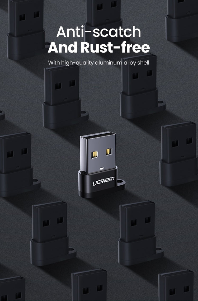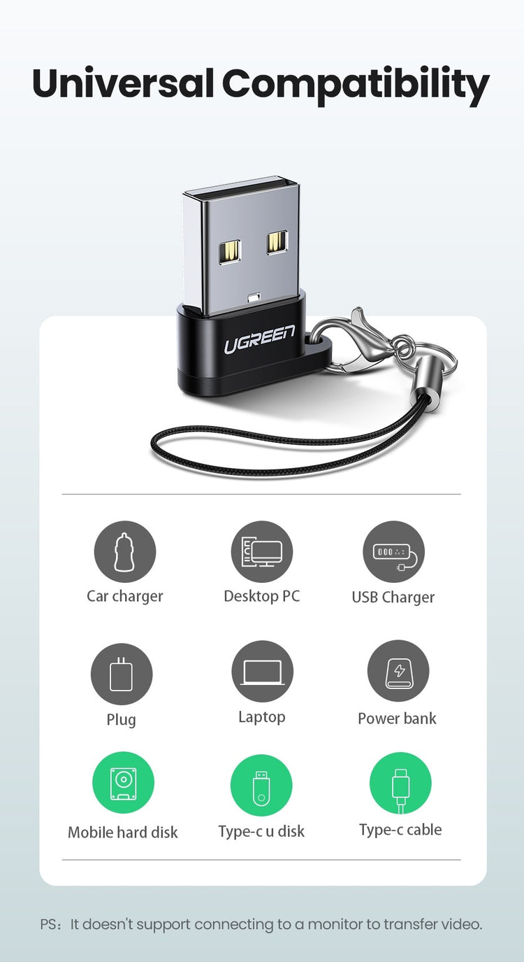 USB C Female to USB Male Adapter: Ugreen's Type C to USB A adapter is designed to convert USB-A ports on laptops, chargers, or other devices into a USB-C port. This allows you to connect USB-C peripherals to devices equipped with USB-A ports.