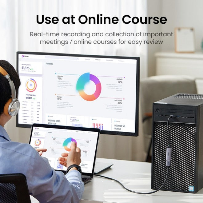Dual Interface Design: Ugreen USB C to HDMI 2 in 1 HD Video Capture Card features USB-A & USB-C dual interfaces, ensuring compatibility with a wide range of devices such as laptops, tablets, and mobile phones.